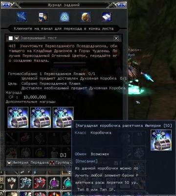 Стартовый персонаж: Рыцарь Ордена Дракона (Генштаб). Задание: Собрать лут с Когтистого Псевдодракона, Стража Громгласного Ящера, Громогласного Ящера, Ящера Тирана. Убить 6 Когтистых Рапторов, Убить ПБ Первозданного Псевдодракона. Награда: Коробочка Удачи 50 уровня, 5 Допингов "Кристал Наяла", 10.000.000 расовой валюты.