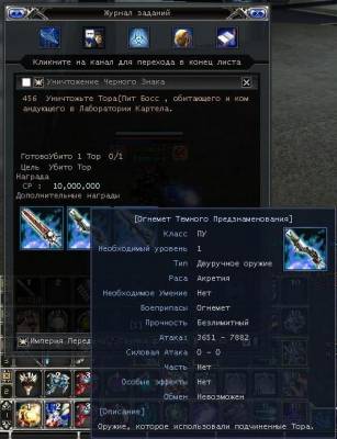 Стартовый персонаж: Торговец Картелы (локация Этер). Задание: Убить 6 Темных Ракетчиков, 6 Воинов-Элефантов, 2 Тора Наёмника и ПБ Тора. Награда: Оружие Тёмного Предзнаменования (временное), 10.000.000 расовой валюты.